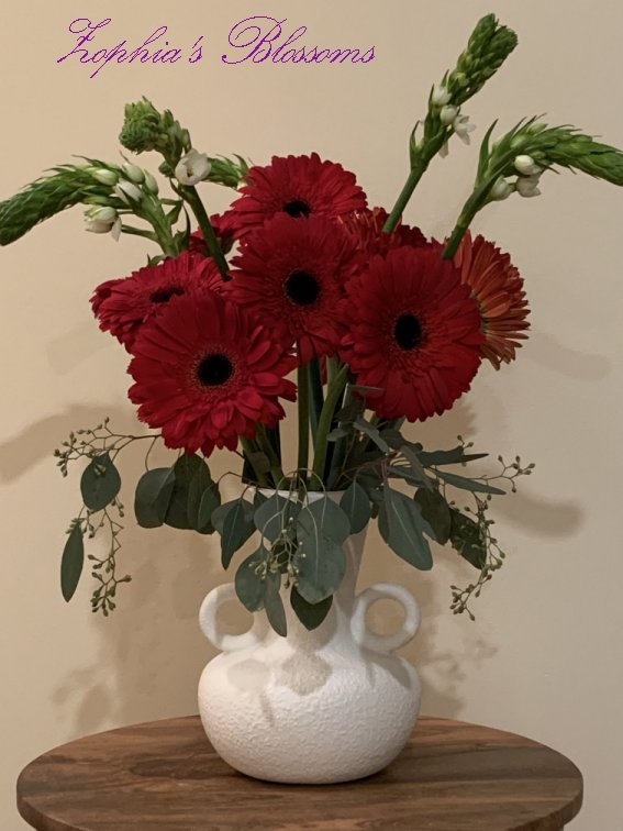This arrangement includes gerberas count of 9, Bethlehem star count of 5, eucalyptus, greenery. Vase as shown. Flower arrangement approximately 18″ high and 14″ round.