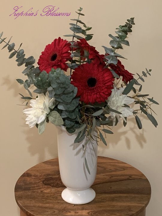 This arrangement includes gerberas count of 5, spider mums count of 3, eucalyptus, greenery. Ceramic vase as shown. Flower arrangement approximately 18″ high and 14″ round.