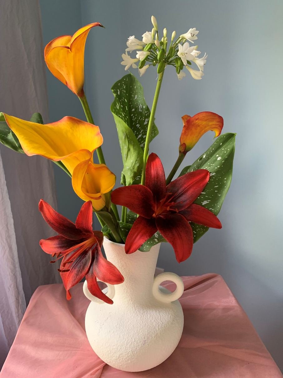 This arrangement includes lilies count of 3 calla lilies, count of 2 Asiatic lilies, count of 1 lily of the Nile, greenery. Ceramic vase as shown. Flower arrangement approximately 20″ high and 12″ round.