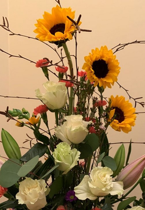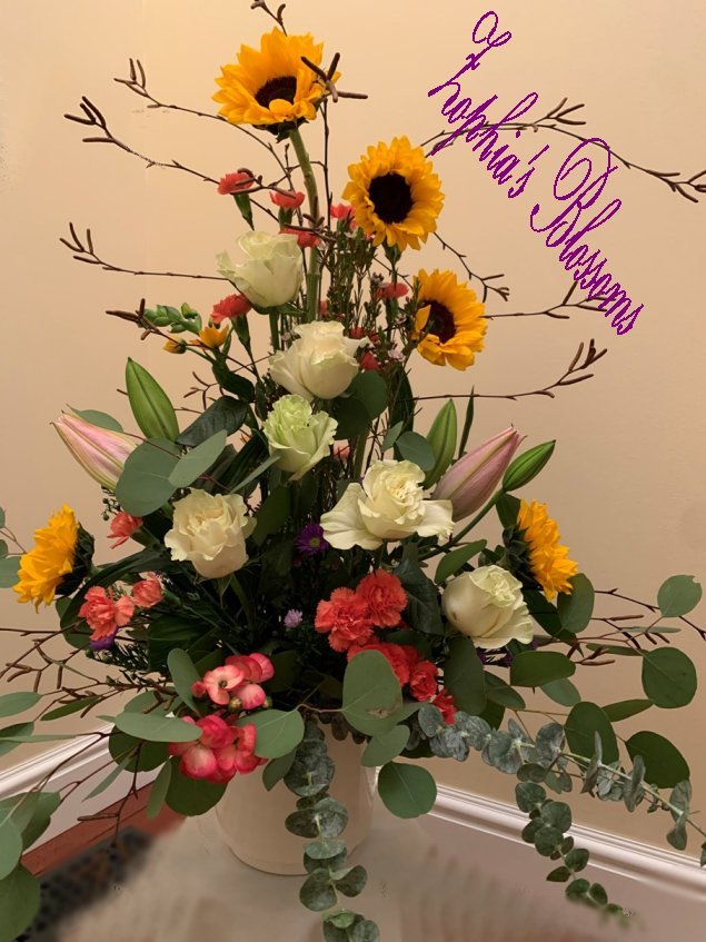 This arrangement includes roses, sunflowers, lilies, carnations, Bethlehem star, aster, eucalyptus, greenery. Ceramic vase as shown. Flower arrangement approximately 26″ high and 16″ round.