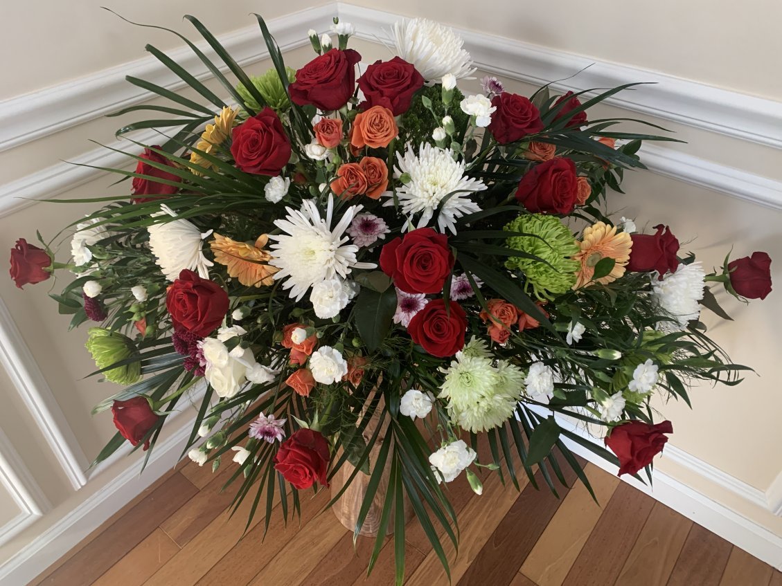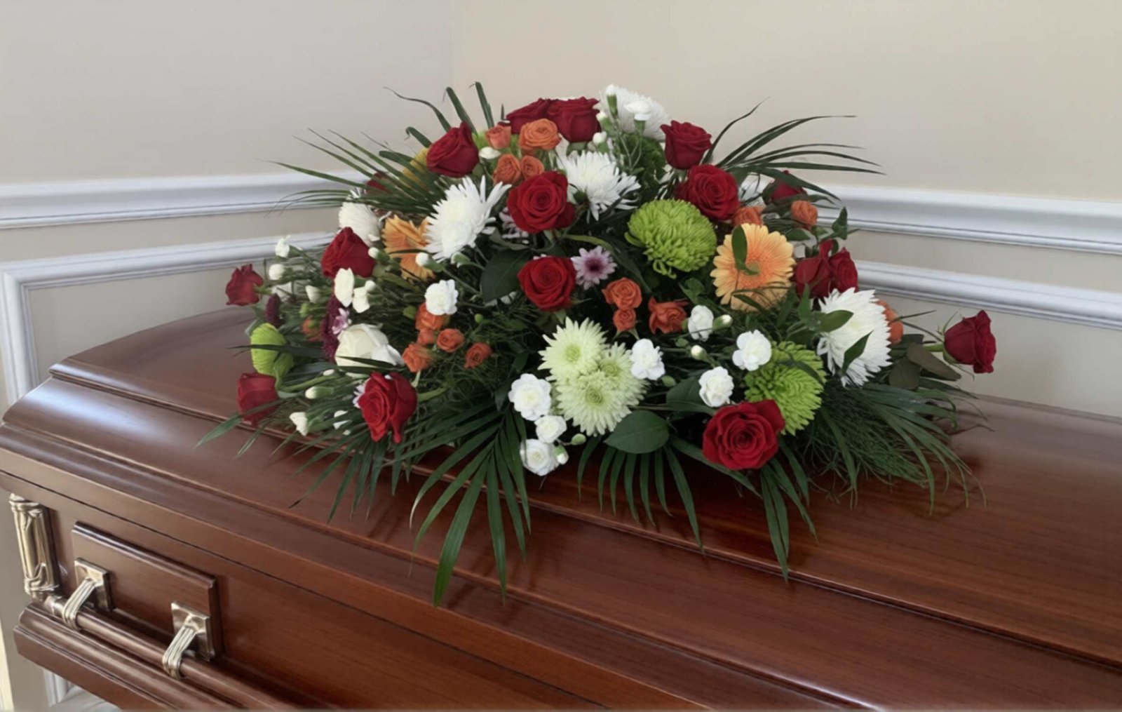 Half casket spray arrangement, depending on type of flowers, is starting at $285.  Size ranges from 24″ to 40″ wide and 24″ to 28″ deep.  Full casket spray arrangement, depending on type of flowers, is starting at $450.  Size ranges from 60″ to 72″ wide and 26″ to 36″ deep.