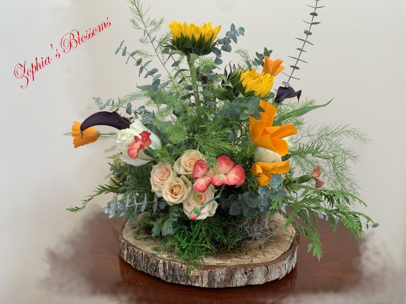This arrangement includes roses, sunflower, poppy, greenery. Tray on wooden ring as shown. Flower arrangement approximately 16″ high and 14″ wide.