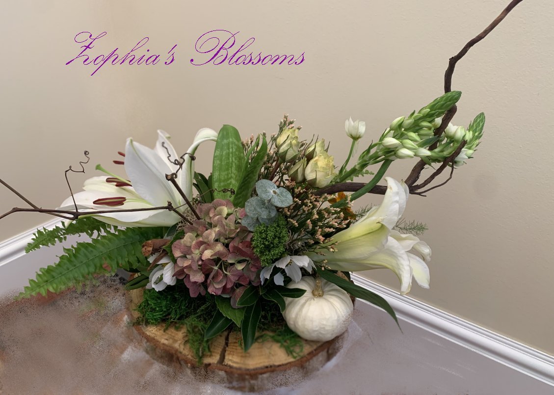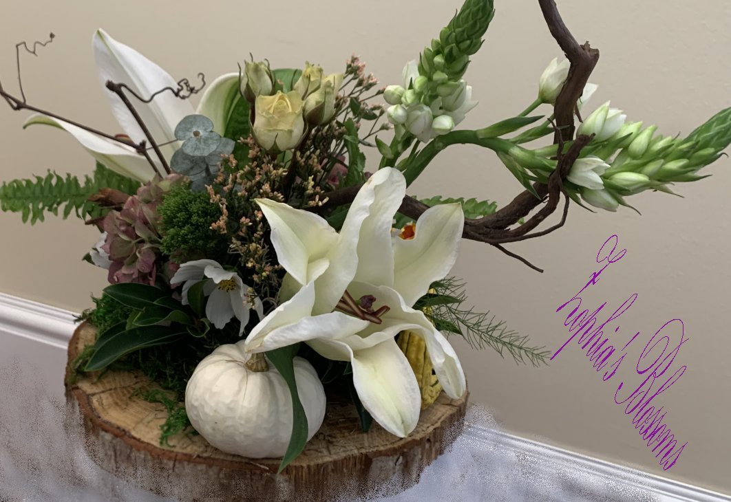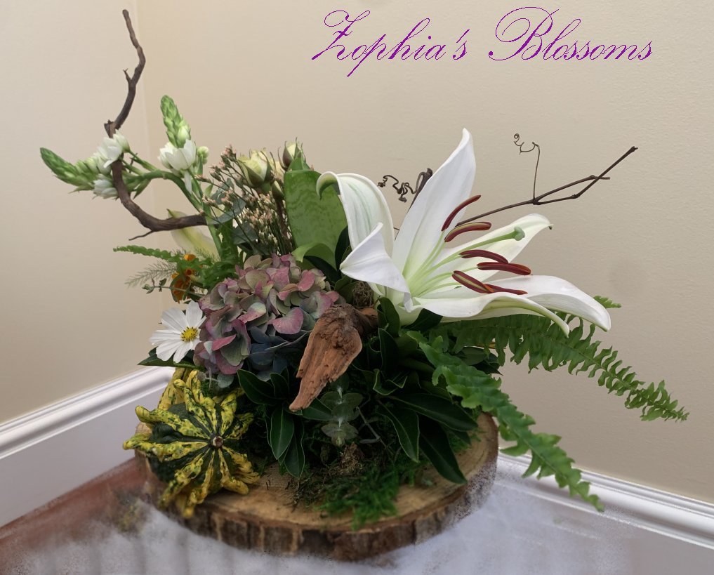 This arrangement includes lilies, roses, greenery. Tray on wooden ring as shown. Flower arrangement approximately 14″ high and 16″ wide.