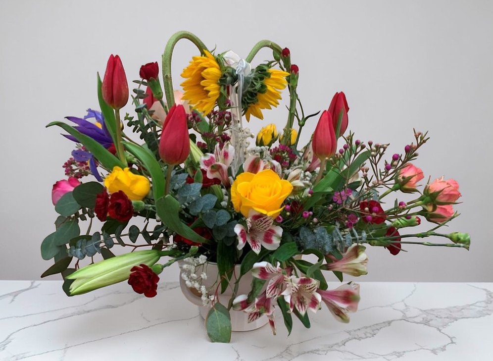 Sympathy flower arrangement for home, mixed flowers set in vase or basket.  Size approximately 16″ high and 24″ round.  Arrangement price starting @ $120 depending of type of flowers and size of arrangement.