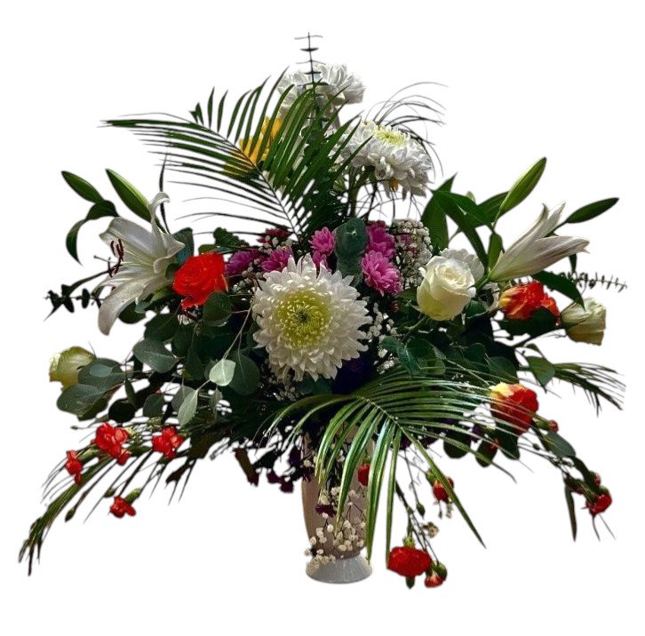 Sympathy flower arrangement for service, mixed flowers set in vase or basket. Size approximately 16″ high and 24″ round. Arrangement price starting @ $120 depending of type of flowers and size of arrangement.