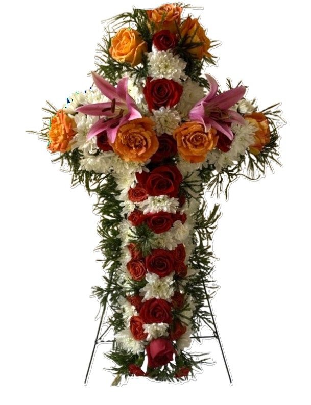 This standing spray cross arrangement, depending on size and type of flowers, is starting at $190.00. Sizes ranges approximately 30″ to 36″ high and 14″ to 20″ wide.