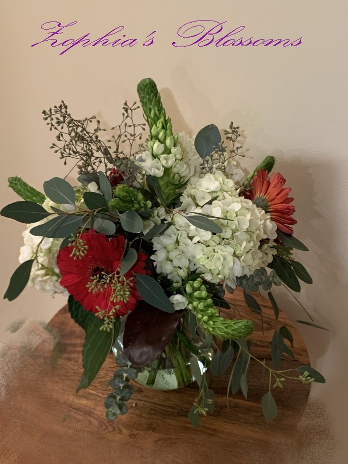 This arrangement includes gerberas count of 1, hydrangea count of 3, Bethlehem star count of 5, curly and seeded eucalyptus. Glass vase as shown. Approximately 18″ high and 16″ round. Bethlehem star are seasonal flowers and not always available, we will do our best to substitute with different flowers to match appearance.