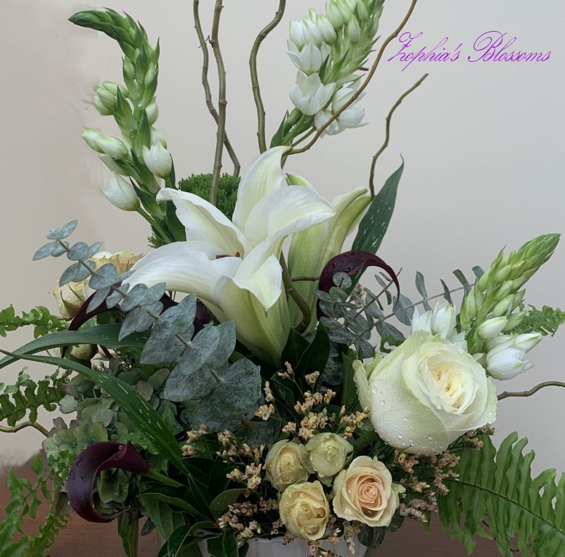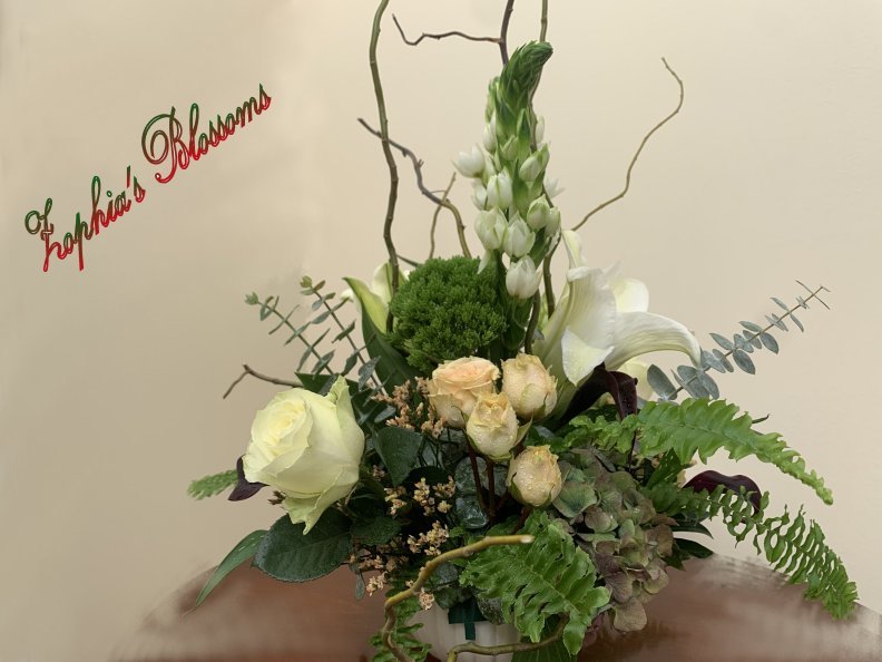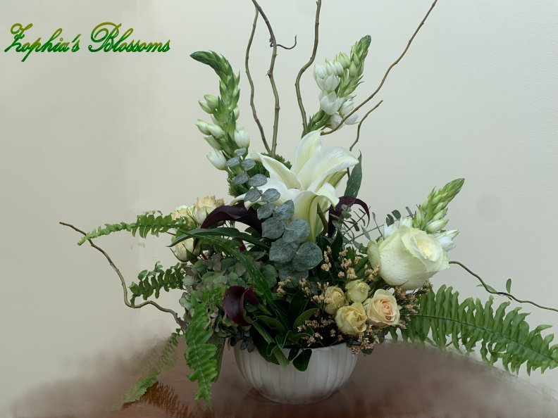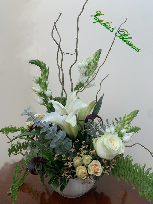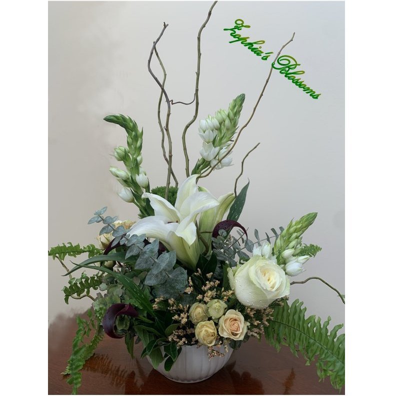 This arrangement includes roses, Bethlehem star, lilies, calla lilies, eucalyptus, greenery. Ceramic bowl as shown. Flower arrangement approximately 16″ high and 14″ wide.