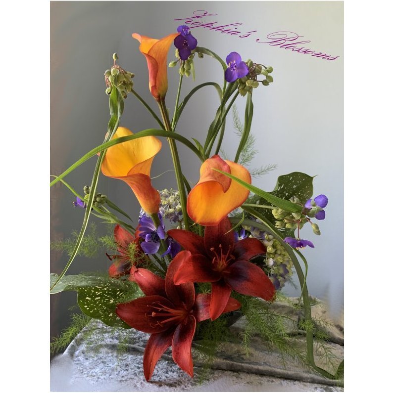 This arrangement includes lilies, count of 12, hydrangea, greenery. Porcelain tray as shown. Flower arrangement approximately 18″ high and 16″ wide.