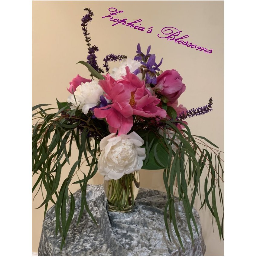 This arrangement includes peony count of 5 white and 5 pink, greenery. Glass vase as shown. Flower arrangement approximately 16″ high and 16 round.