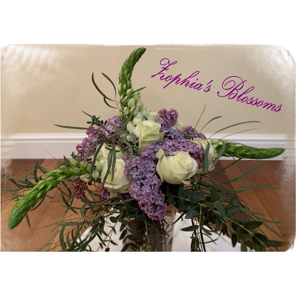 This arrangement includes roses count of 7, Bethlehem star count of 3, lilac, greenery. Glass vase as shown. Flower arrangement approximately 16″ high and 18″ round.