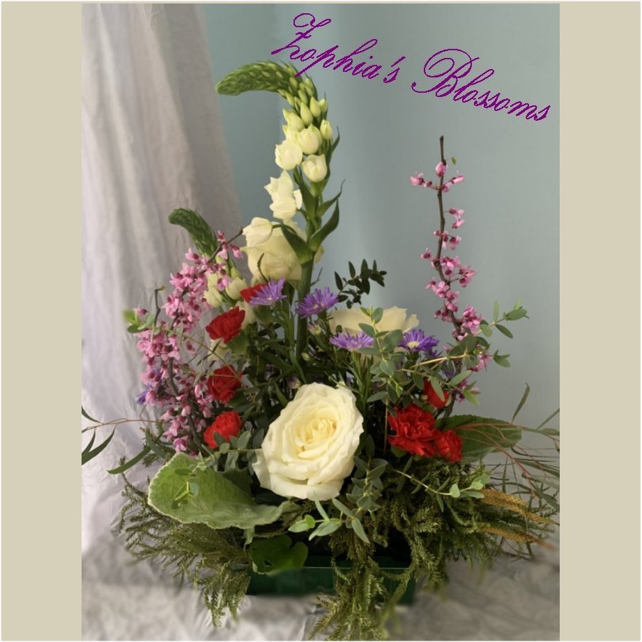 This arrangement includes roses count of 3, Bethlehem star count of 2, carnations, redbud, eucalyptus, greenery. Ceramic tray as shown. Flower arrangement approximately 16″ high and 14″ wide.