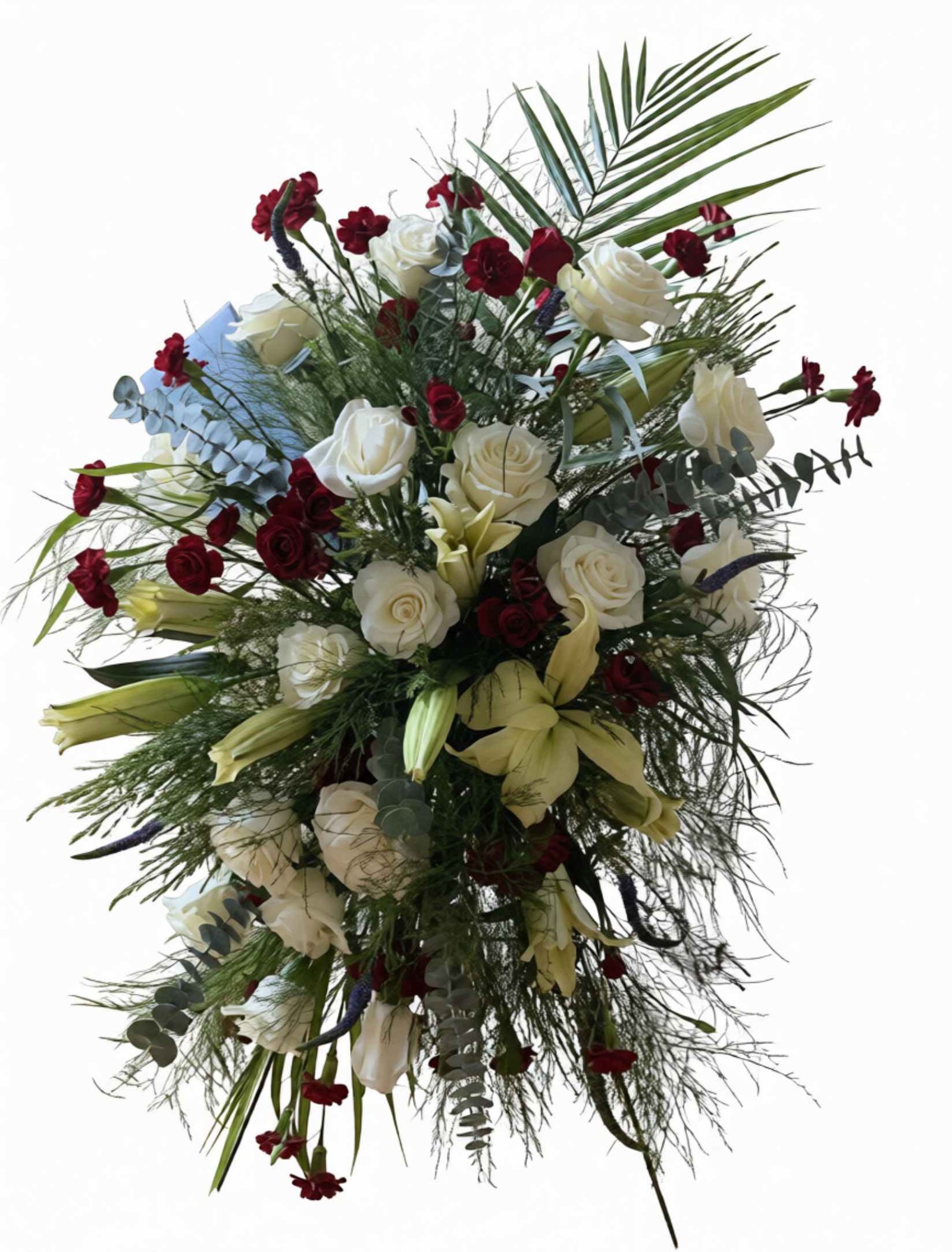 This standing spray arrangement, depending on size and type of flowers, is starting at $220.00. Sizes ranges approximately 36″ to 60″ high and 24″ to 36″ wide.